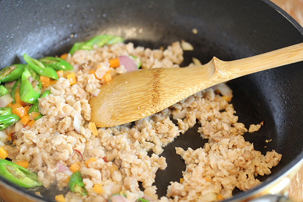 3 2に野菜を加えてさっと炒め、大豆ミートと塩を加えてさらに炒める。