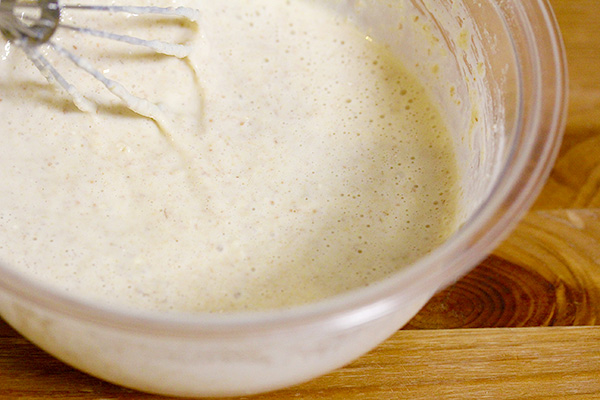 4 テフロンフライパンを弱火で熱し、3の1/6量を流し入れ、表面が乾いたら裏返して両面きつね色に焼く。同様に全部で6枚焼く。