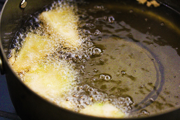 3 21をくぐらせ、170℃の油でからっと揚げる。